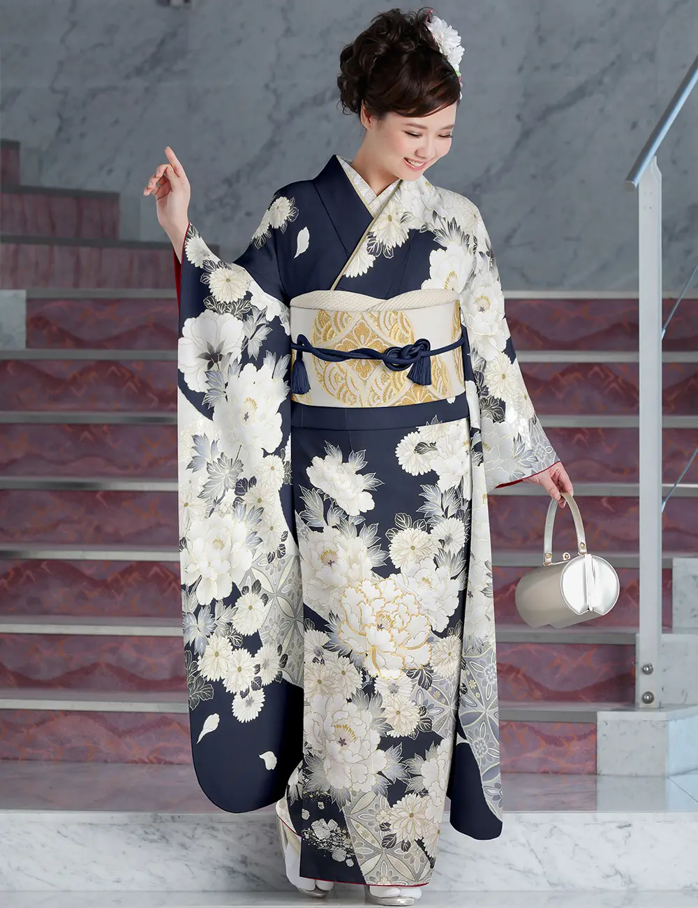 夜空のような深く落ち着いた藍色が印象的。白とゴールドでくっきりと描かれた意匠は人生の節目にふさわしく、おしゃれな着こなしが叶います。