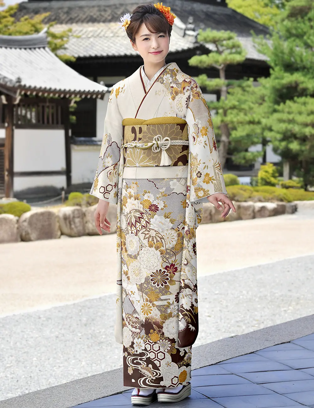万寿菊や毬、貝桶など定番のモチーフもラテカラーで描くと新鮮な雰囲気。トレンド感を存分に楽しめる一枚は、コーディネートにもこだわって。