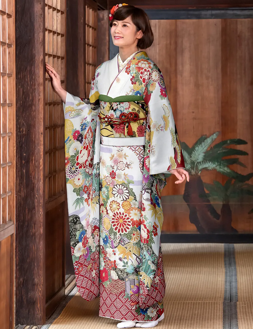 品のよさがにじみ出る、白い振袖。金彩に縁取られた万寿菊や牡丹と共に紅白の椿が華やぎ、やさしいパープルの霞が女性らしさを引き出します。