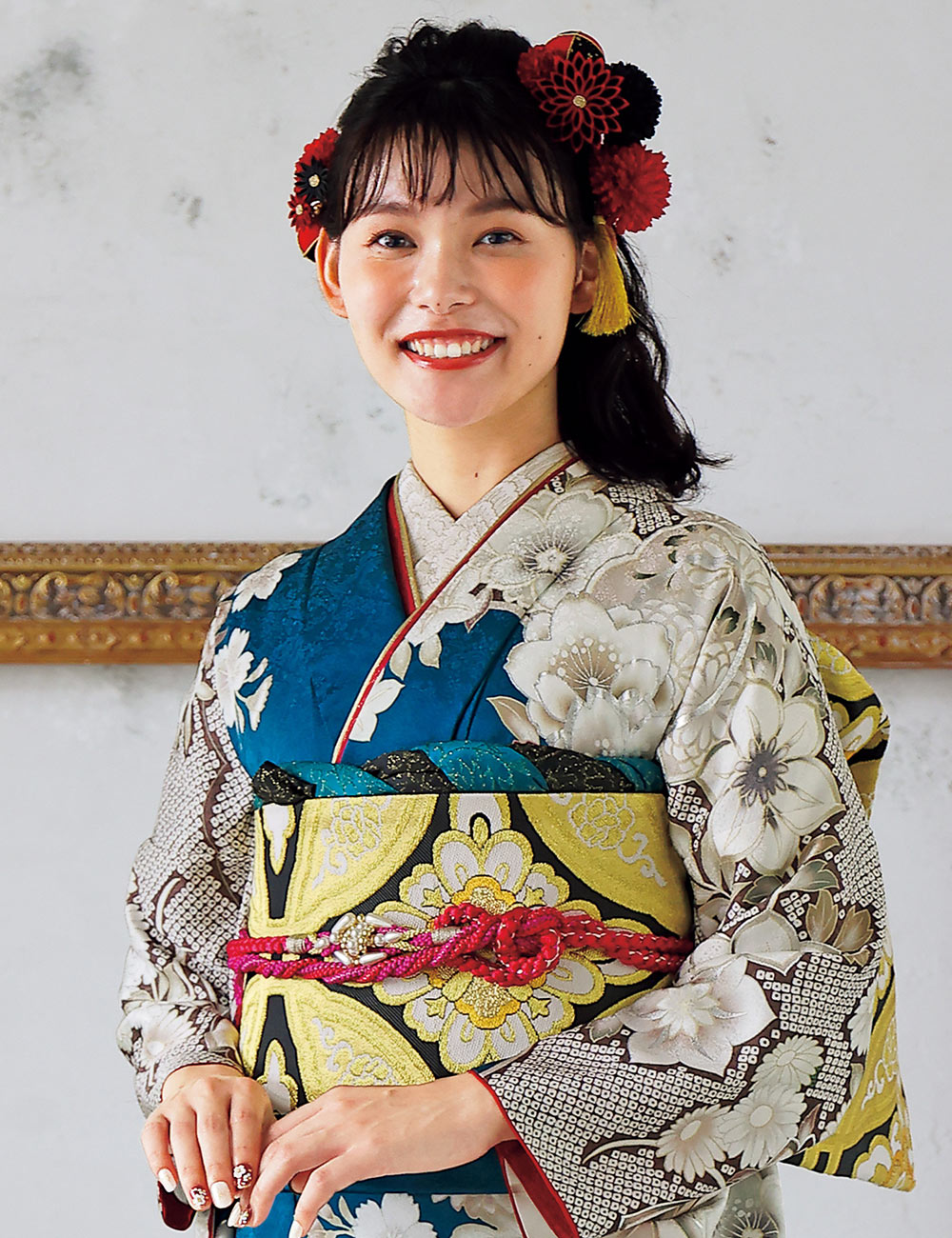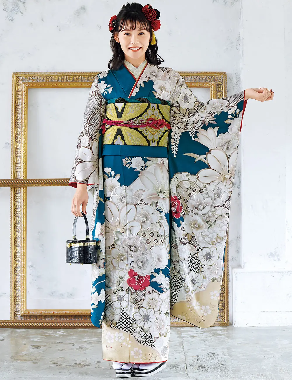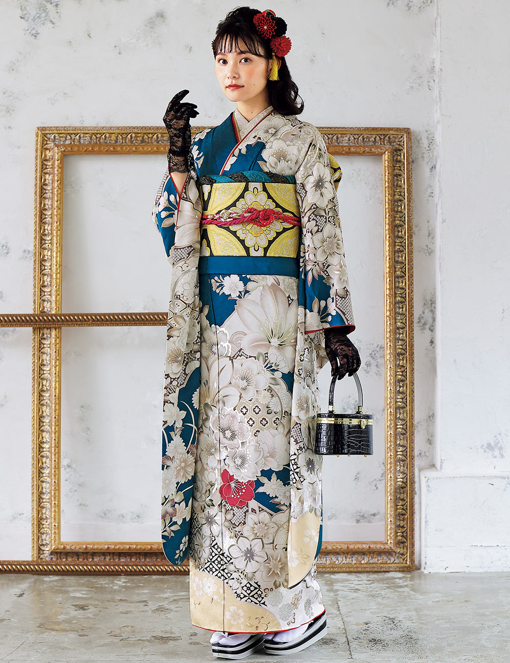 シックな浅葱色に胡粉色の柄付けが唯一無二の装いを演出。銀彩に包まれて見頃を迎えた愛らしい桜は、これから始まる幸せな日々を映します。