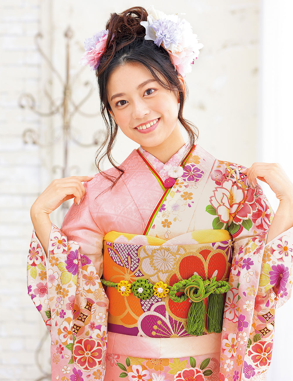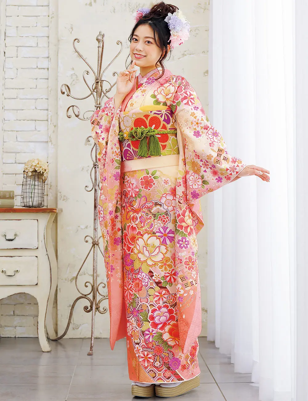 淡いピンクに牡丹、梅、桜とお花が主役のデザインが若々しい雰囲気。軽やかにはずむ毬をアクセントに、飛躍する未来への祈りを込めて。*写真の帯・小物は撮影用のイメージ商品です。