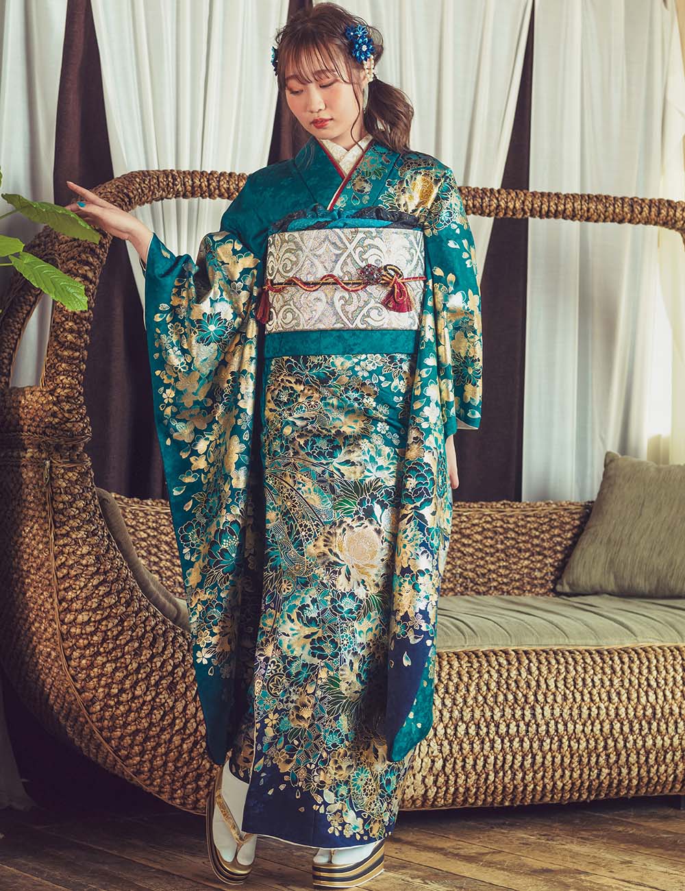 エメラルドグリーンから群青へ変わる色の変化が叙情的。牡丹や桜、束ね熨斗など、めでた尽くしの絵柄を金彩が冴え渡り、凛々しいレディの誕生です。