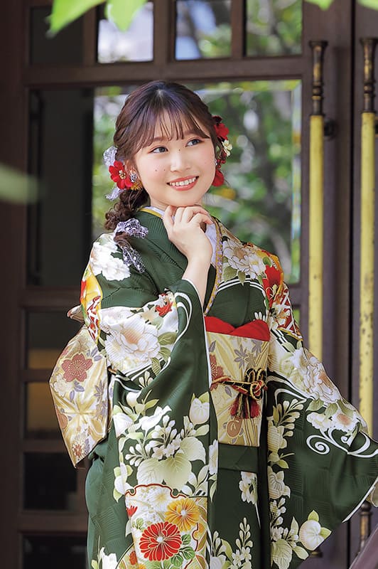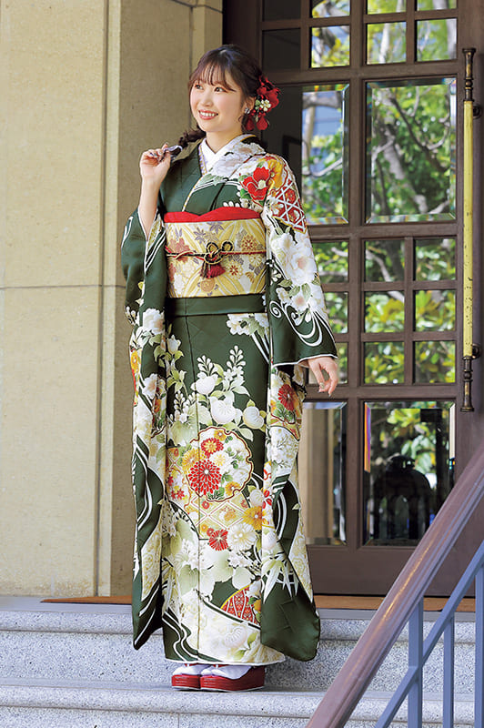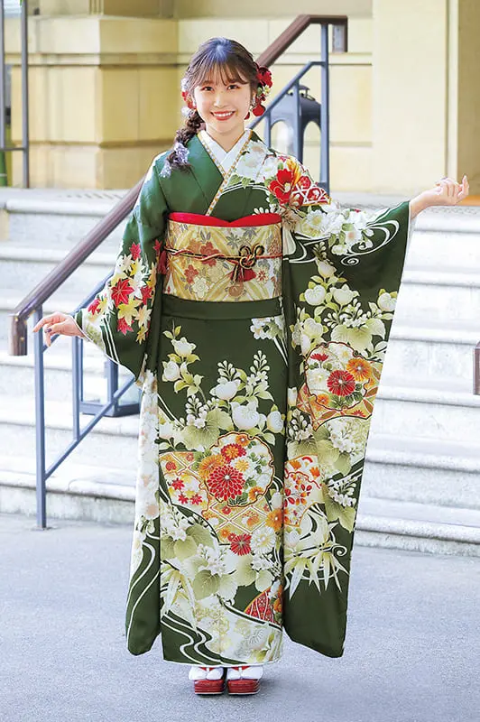 縁起のよい松や竹、万寿菊や橘と溶け合う雪輪は凛と誇らしげ。金箔を施した流水文様が優雅な抹茶色の一枚は、鮮烈なインパクトを放ちます。*写真の帯・小物は撮影用のイメージ商品です。