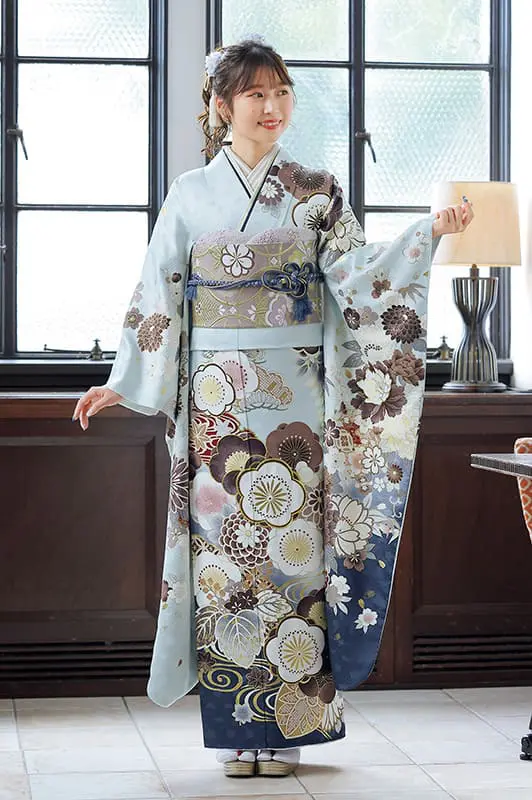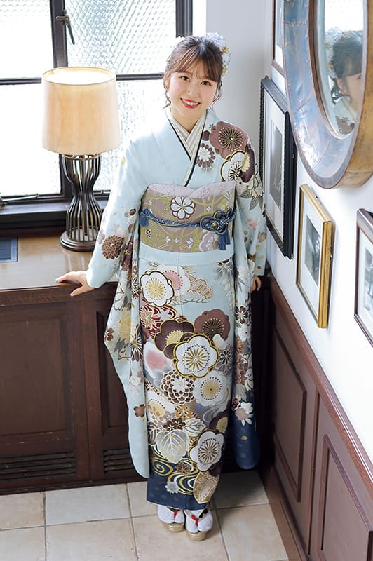 水色の地色にゴールドが華やかさを増して。春の訪れに心躍る梅や菊を桜の花びらが可愛らしく、さりげない流水文様が魅力を秘めます。*写真の帯・小物は撮影用のイメージ商品です。