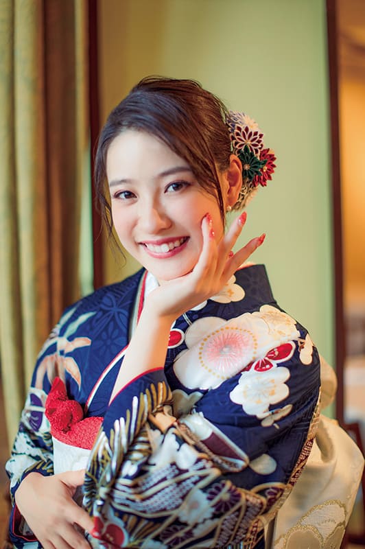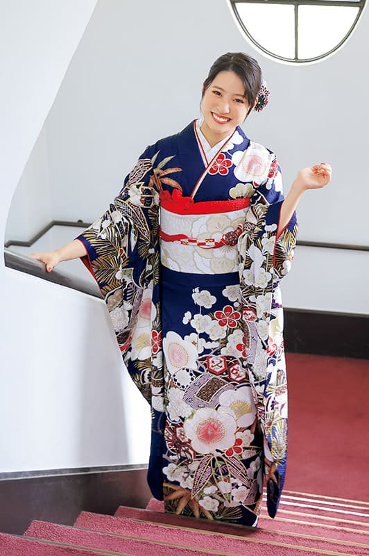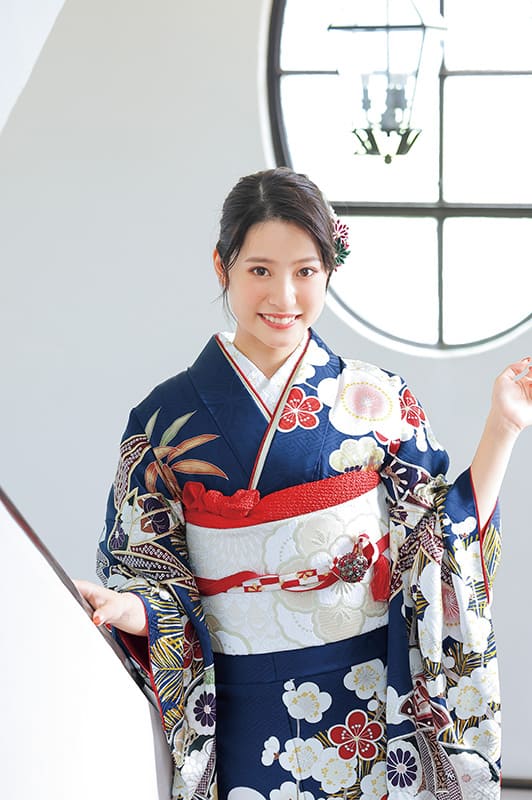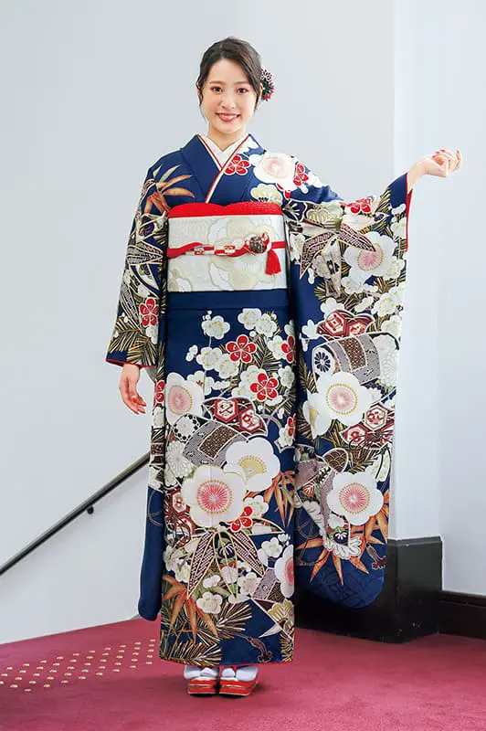 たおやかに描かれた宝尽くしや花傘が、記念すべき節目にエールを送ります。輝かしい未来を予感させる金青の晴れ着で、自身に満ちた一歩を。*写真の帯・小物は撮影用のイメージ商品です。