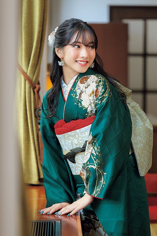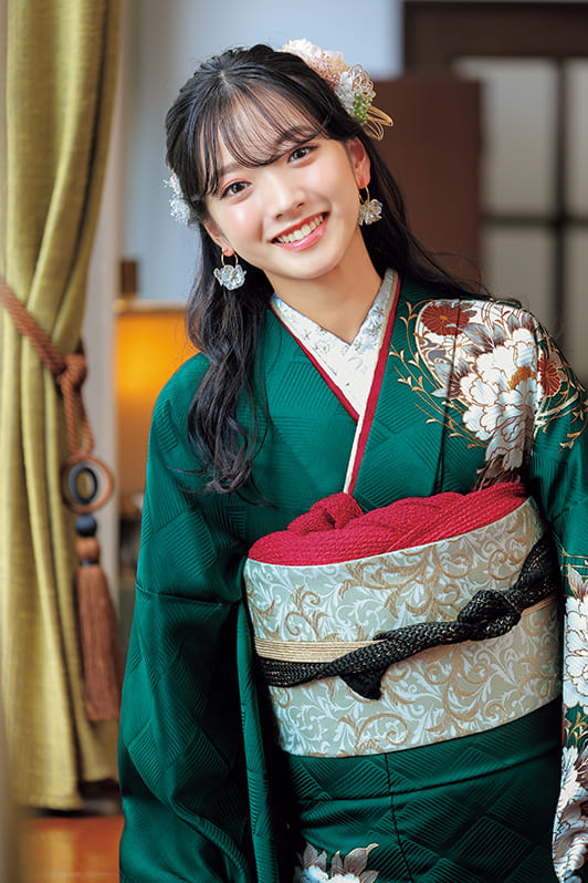高貴な匂いに包まれた牡丹に、はんなりと寄り添う枝垂れ柳。情感を誘う深緑の生地はドラマティックな輝きを携え、憧れのレディへステップ。