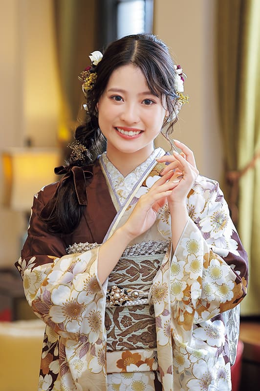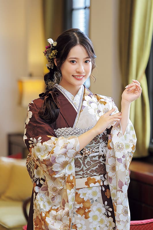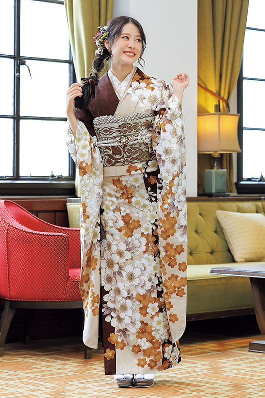 大人モードの茶色をベージュを縦に配置した、おしゃれ度の高い晴れ着です。桜づくしの柄行は待ちわびた季節を慶び、初々しい笑顔がこぼれます。*写真の帯・小物は撮影用のイメージ商品です。