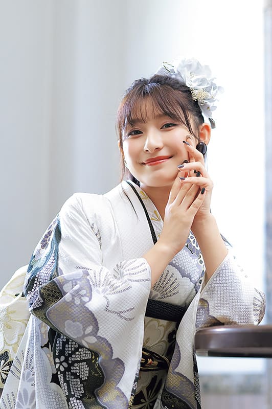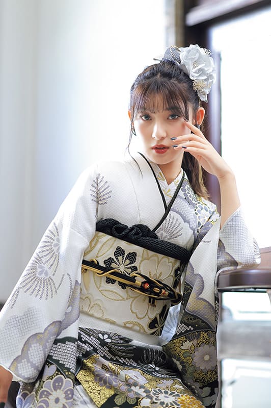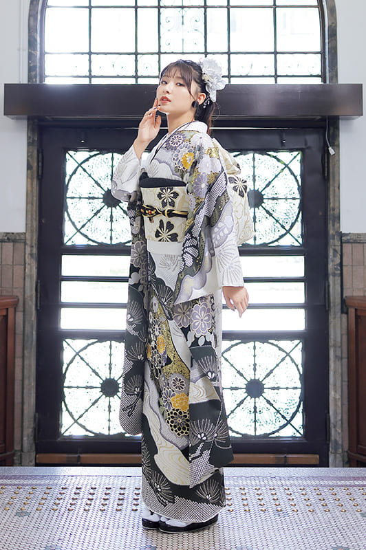 繊細な疋田しぼりと光り輝く流水文様が絶妙にマッチし、晴れの日を演出。白、黒、グレーのモノトーンで魅せる立ち姿が記憶に残る一枚です。