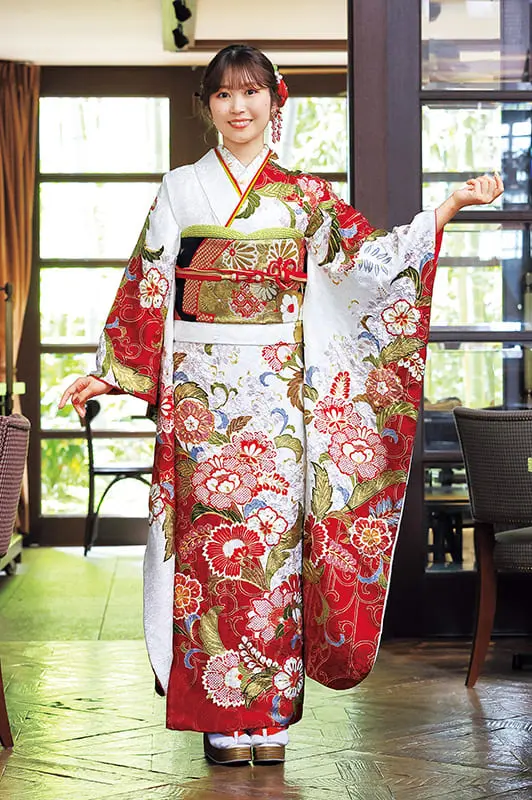 異国の風に魅せられた牡丹唐草が映し出す、格別の風雅をひとり占め。由緒正しき紅白地と吉祥の草花が相まって、とびきりの幸福へといざないます。*写真の帯・小物は撮影用のイメージ商品です。