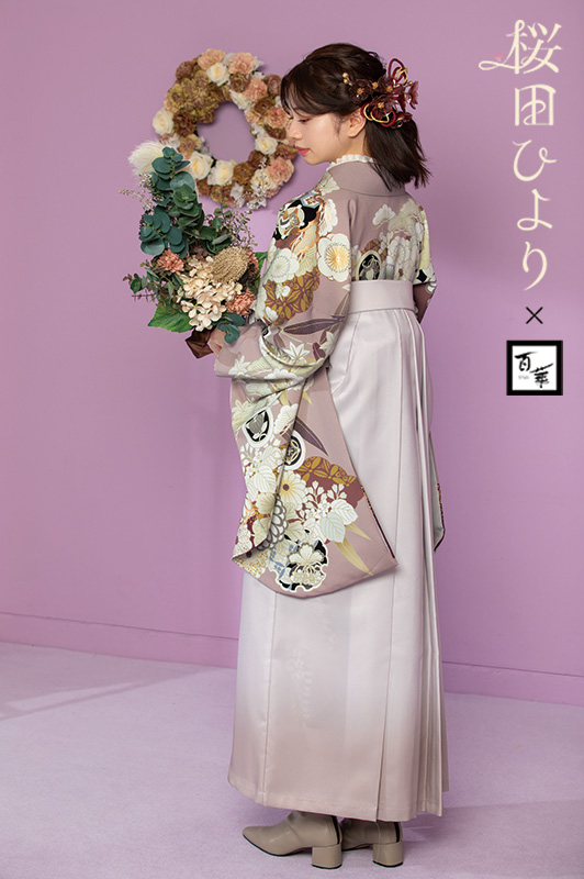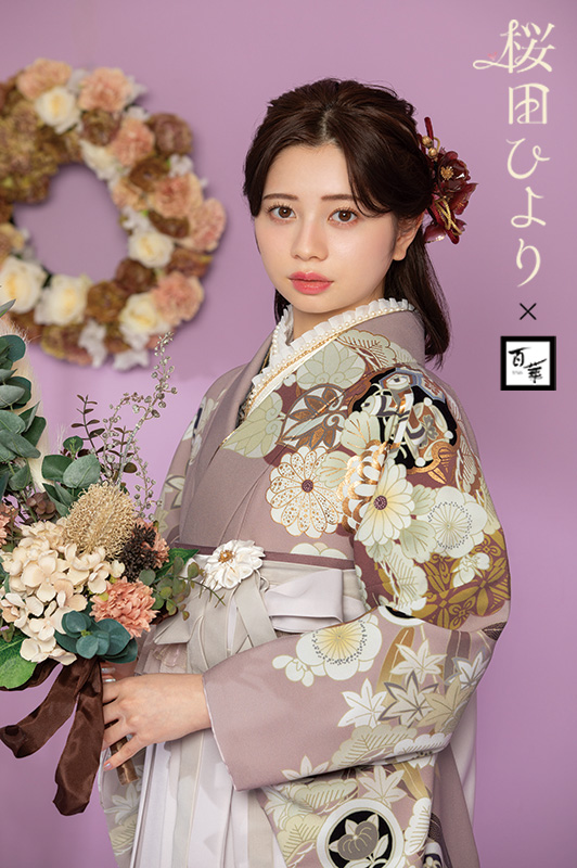 桜田ひよりちゃんが着こなす最新振袖ブランド「桜田ひより」。大切な卒業式は新成人の女の子から多数の支持を集める人気袴で!*写真の帯・小物は撮影用のイメージ商品です。