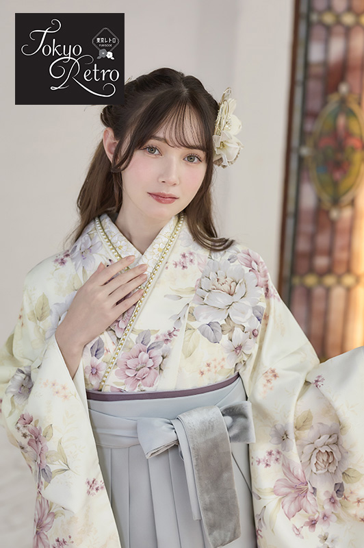古き佳き時代の柄をリスペクトした、レトロな花たちが主役の振袖、東京レトロ。*写真の帯・小物は撮影用のイメージ商品です。