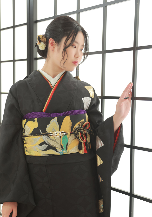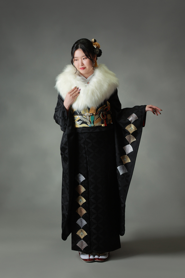 柄は、金と銀の扇のみ。一つの柄に絞り、裾と振りにだけ描かれていることでよりシンプルで粋な振袖になっています。扇柄(扇面)は、広げたときに末広がりの形をしていることから子孫が繁栄するようにという願いを込めて着物の柄に使われるようになりました。黒留袖を着たときに身に付ける扇子も、こういった意味から末広と呼ばれているんですよ♪