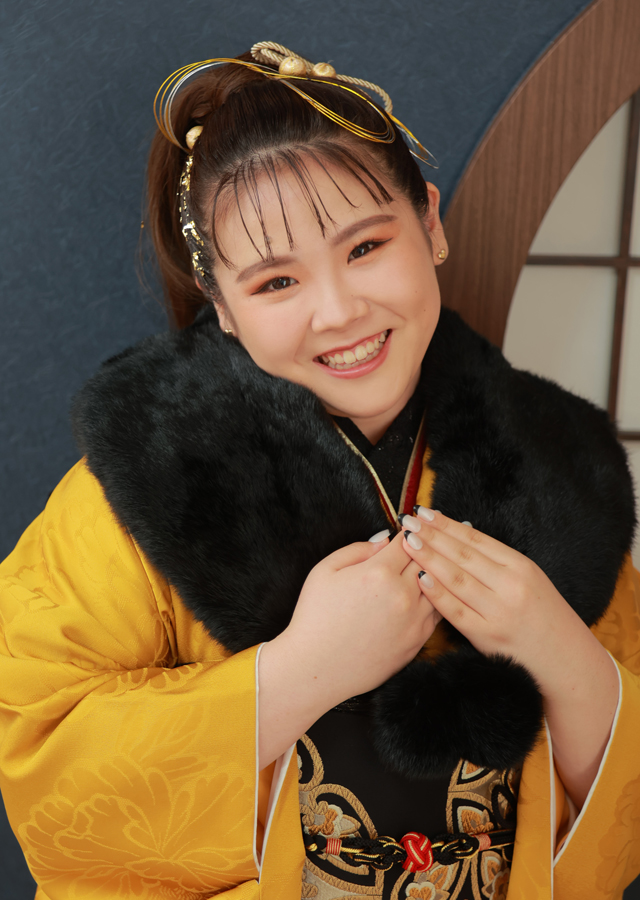 こちらのお嬢様は、あえて差し色を入れず小物も白で統一してこだわり、コーディネートしたそうです!レースのような洋風なテイストで描かれた地模様は、まるでドレスのような華やかさがありますね(*^^*)白は光を最も反射するお色なので、お顔写りもばっちりです!