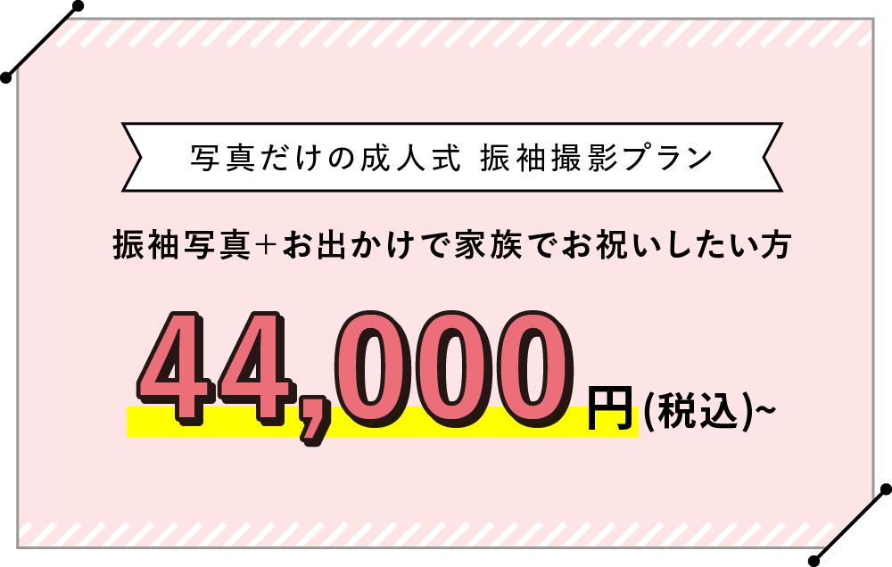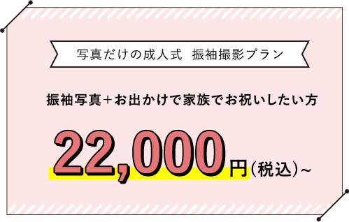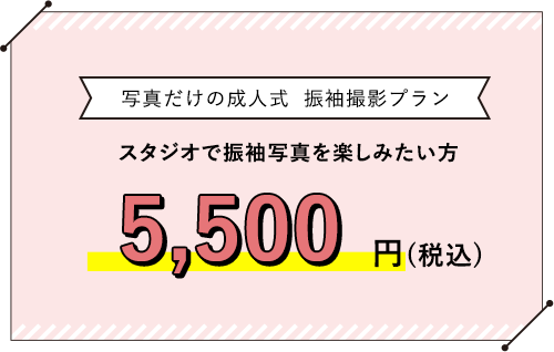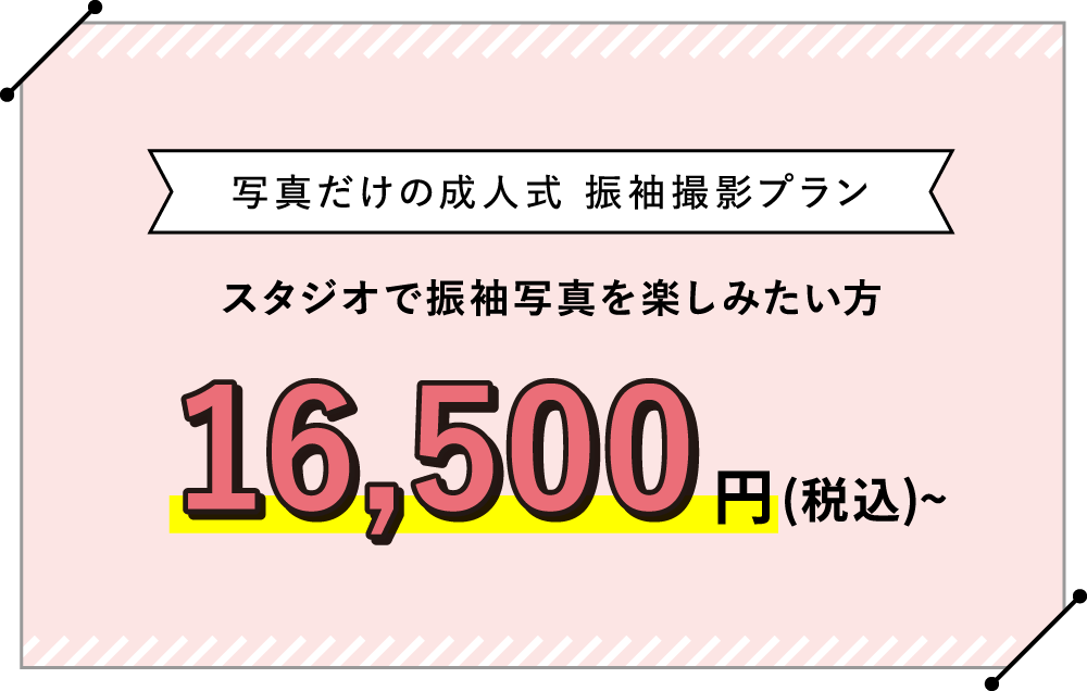 「写真だけ成人式」プランなら振袖レンタル・着付け・ヘアメイク・撮影まで全て込みで、16,500円からご用意。別途アルバムをご選択いただく、安心・満足プランがございます。