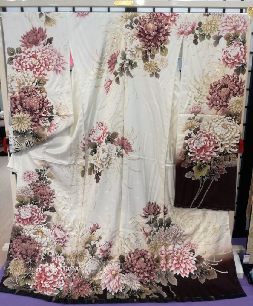 こちらの振袖は、白地に裾が茶系の配色に大人ピンクの菊が描かれています。肩から裾まで華やかな柄付けですので、遠くから見ても着映えされる振袖ですね。