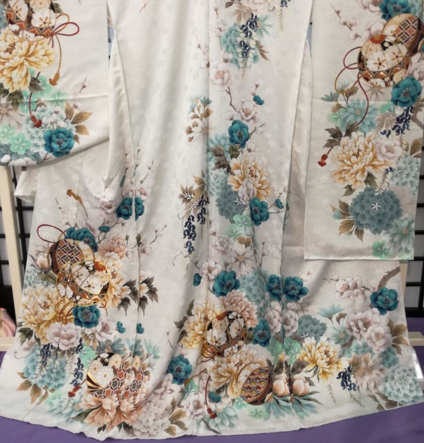 ふつふつと人気を集める水色とグリーンの中間色のような色、浅葱色(あさぎいろ)や空色がポイントとして色が使われていますね!全体に柄付けされているので、前から見ても後ろから見ても華やかです。柄には、毬(まり)の柄をメインに牡丹の花や桜お花などが描かれています。毬は、3歳・7歳のお着物にもよく登場します。