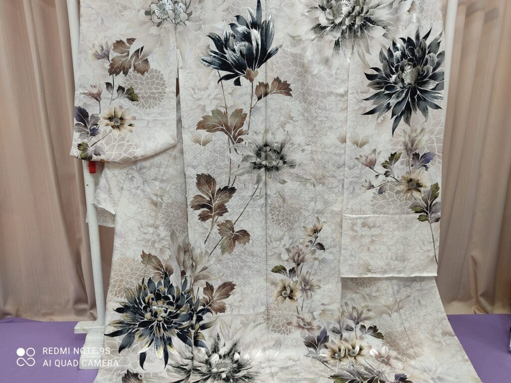 菊が入っているので、中には葬儀のイメージがあり『菊が入っていないものはないのですか』というお声も聞くのですが、率直にお答えしますと菊は、格式が最も高いお花で、縁起の良い柄として振袖など晴れの日の着物には、必ずと言っていいほど多く使われることがあります。