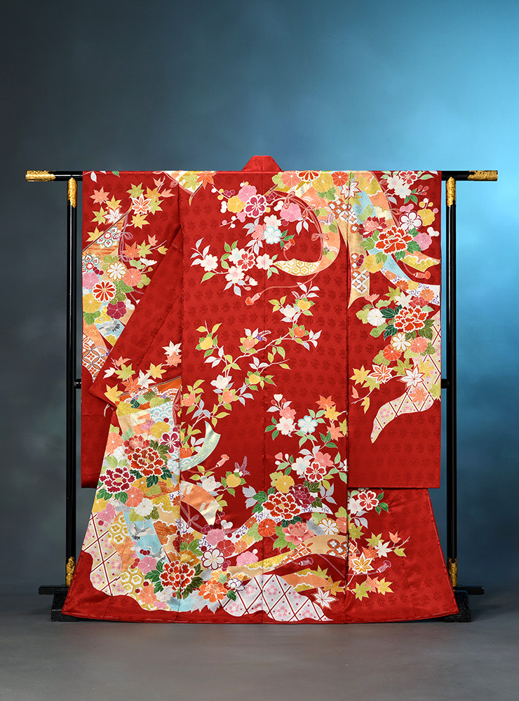 鮮やかな赤に、ゆれ動く几帳と、牡丹が風雅な印象の振袖。