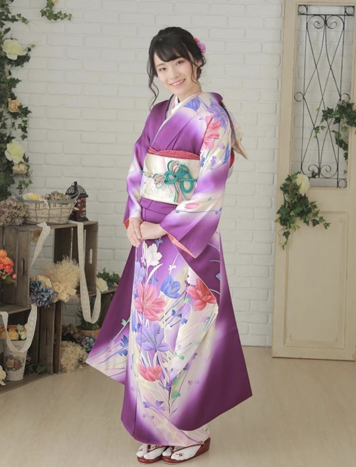 紫色から青、朱色まで鮮やかなグラデーションが目を引く振袖。