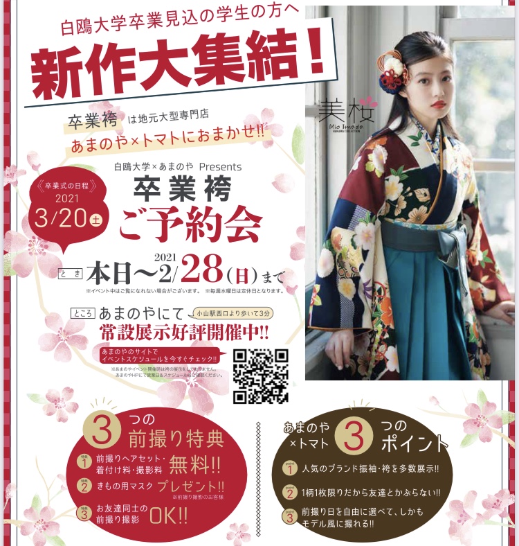 現在、2021年3月卒業見込みの白鴎大学の皆さまを対象として、卒業袴レンタルのご予約会を開催しております。