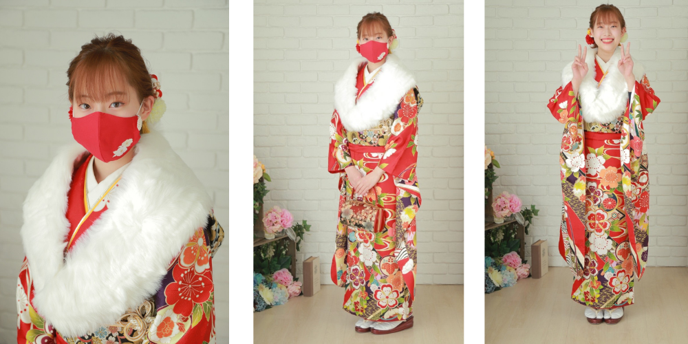 お着物の色から一色とって赤のマスクをコーディネート♪