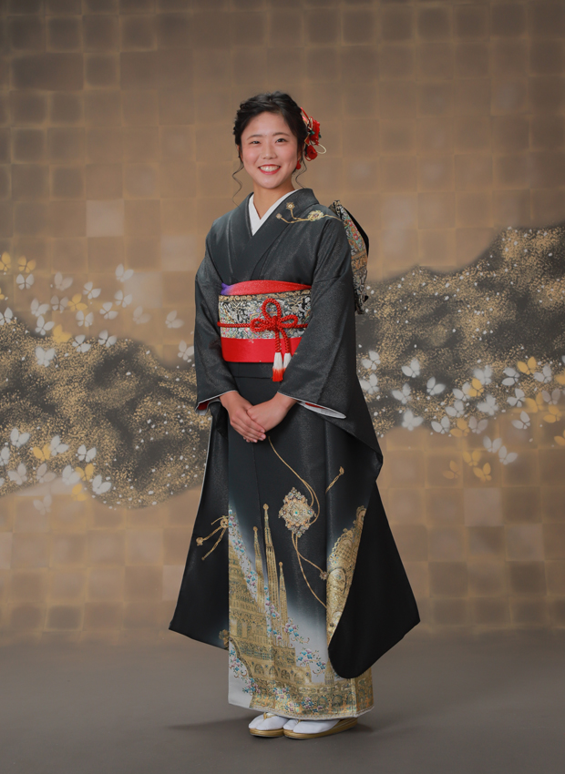 落ち着いた黒に金糸の柄がとても華やかな振袖に、