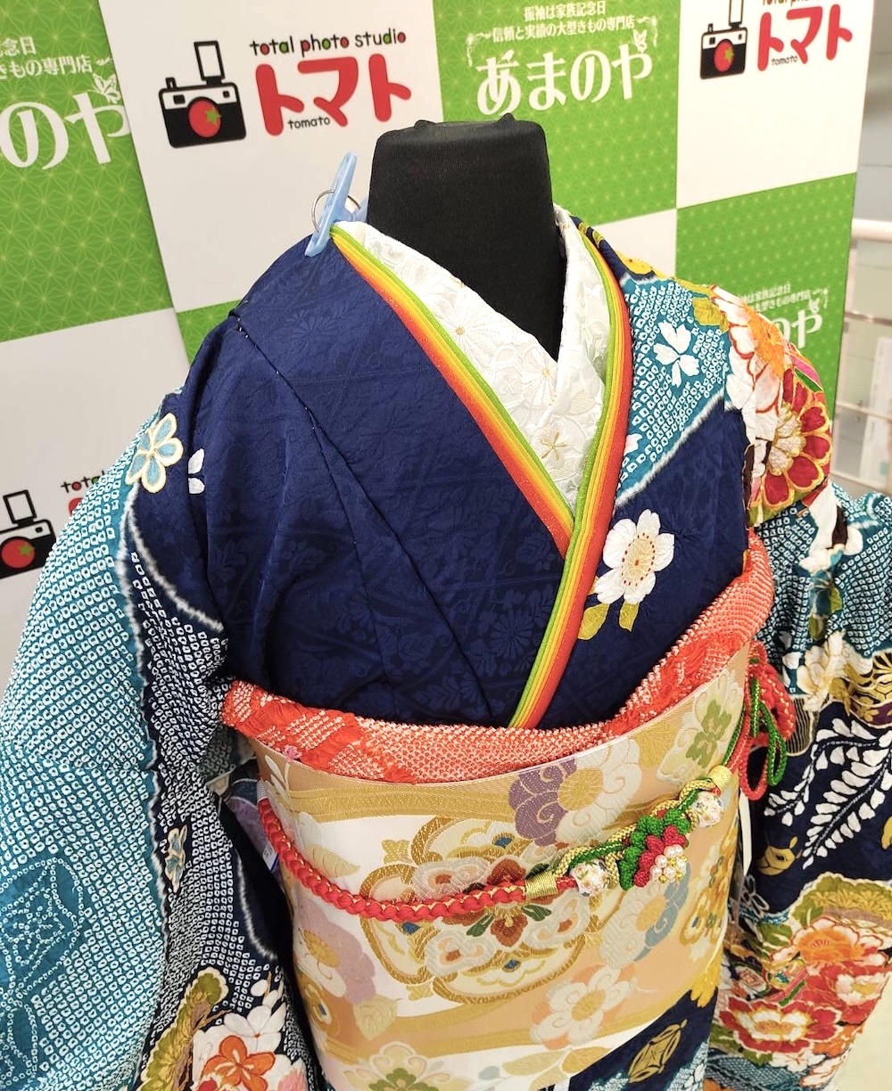 A. 伝統的な日本のイメージ。絞りと藍色に抑えたゴールドで上品になるようにまとめてみました。5色使いの重ね衿で豪華さを、着物のお柄と同じような飾りの帯締めで可愛らしさも入れました!