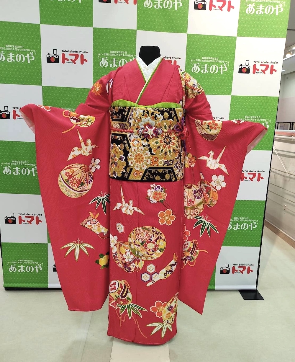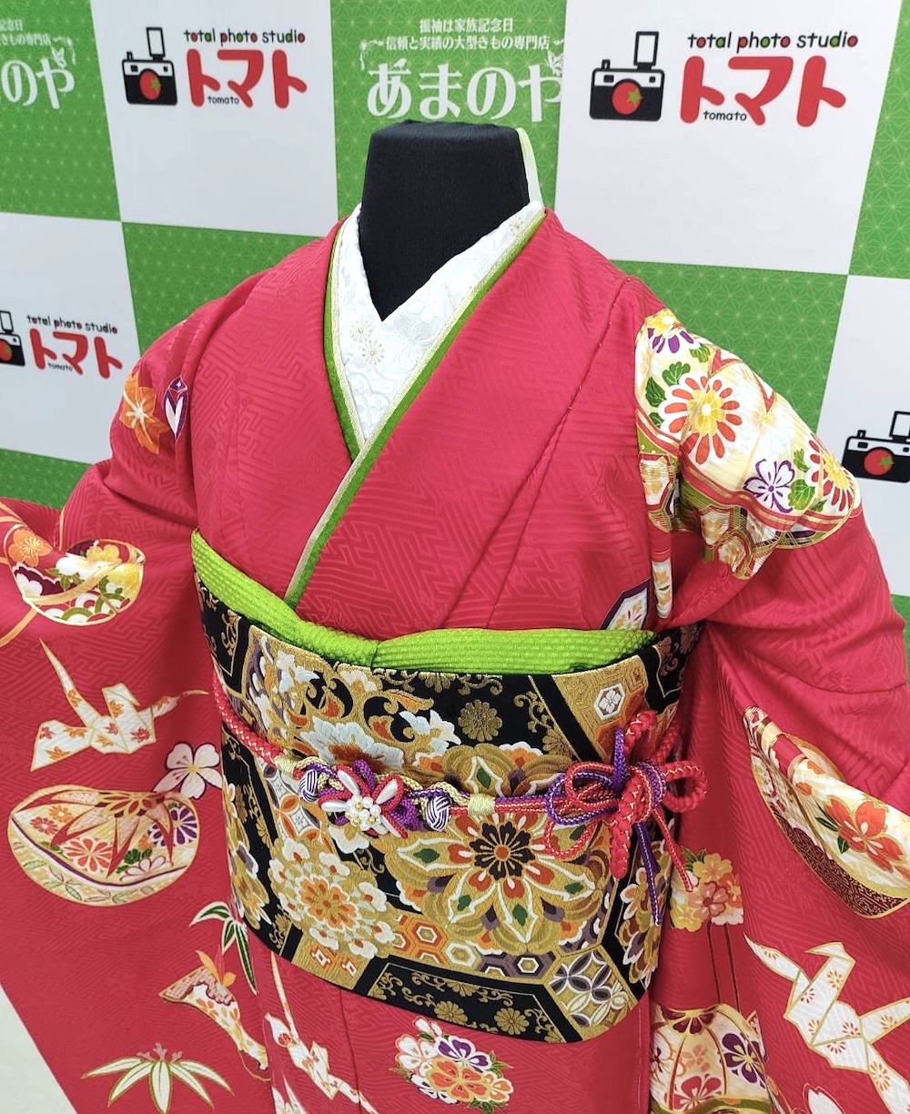 赤地色に無地場の多いスッキリ系の振袖で、柄が折鶴、毬(まり)羽子板(はごいた)など可愛らしい柄づけでしたので、帯に黒を持って行き全体に締めたコーディネートにしました!