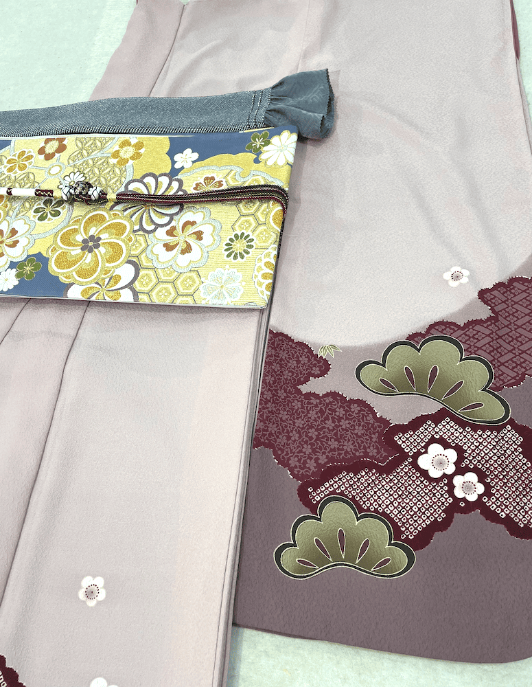 今の季節にぴったりの水羊羹のような優しい色合いのお振袖。日本女性を美しく引き立ててくれるくすんだ紫の色合いと、丸い梅や松の柄もレトロでかわいらしい一枚です。