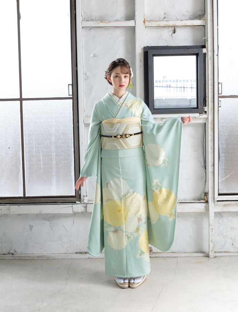 2021年トレンドの緑の振袖。淡い緑は、着る人の爽やかで優しい雰囲気を引き立ててくれます。