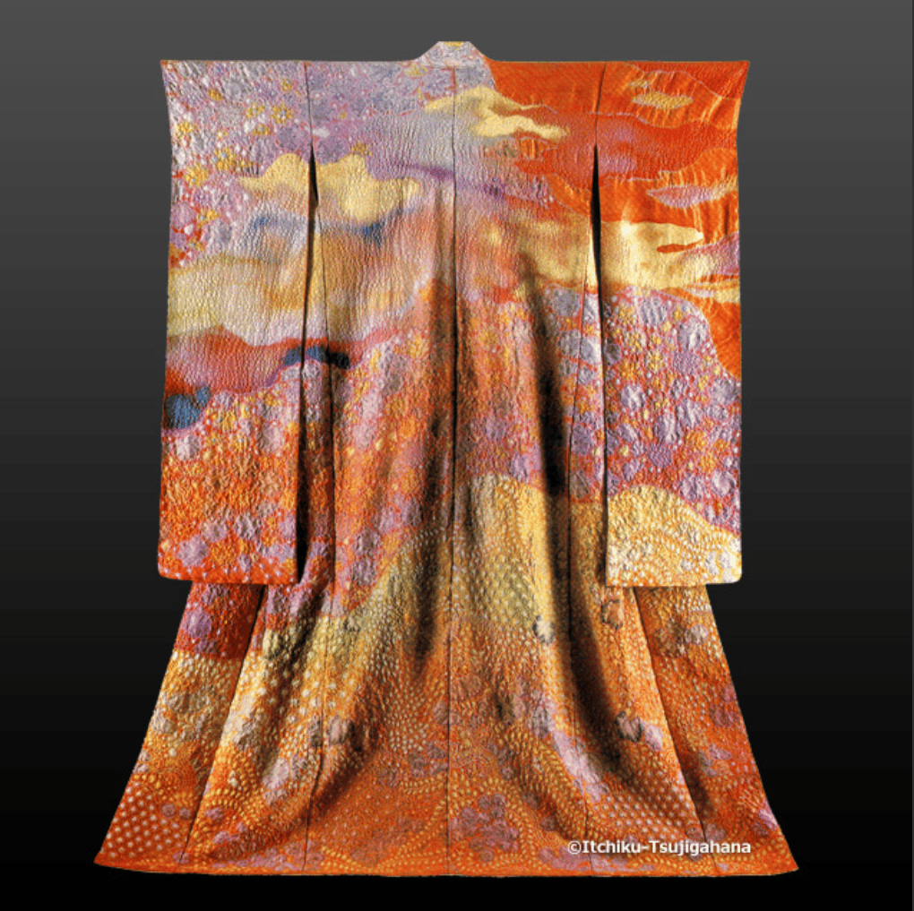 久保田一竹氏は、自身の創意工夫、「度重なる重ね染め・重厚な絞り・独創的デザイン及び色調」を主とした技術を「一竹辻が花」として、本来の辻が花とは異なる新しい時代の辻が花を確立し、昭和50年代の「辻が花ブーム」の火付け役となりました。「富士山」「光響(こうきょう)」などの作品を残し、「辻が花といえば久保田一竹」と言われるほど、国内外で高く評価されています。
