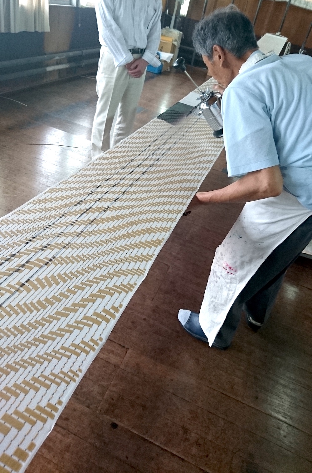 染めないところに糊をのせる伏せ糊(糊伏せ)の工程です。型紙を白生地に載せ、染めないところを糊で伏せていきます。写真の白い部分は染まり、茶色い部分は染まらないようになっています。
