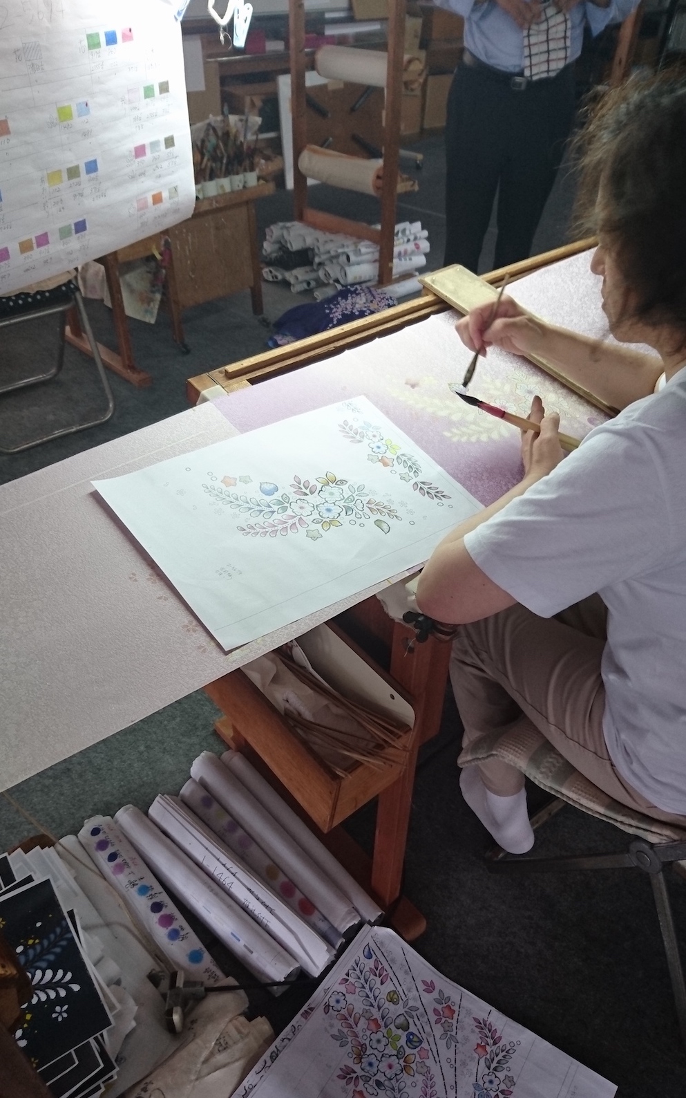 染料を使い分け、図案にそって色付けしていきます。この工程により、繊細で美しい、幻想的な絵柄が浮かび上がります。