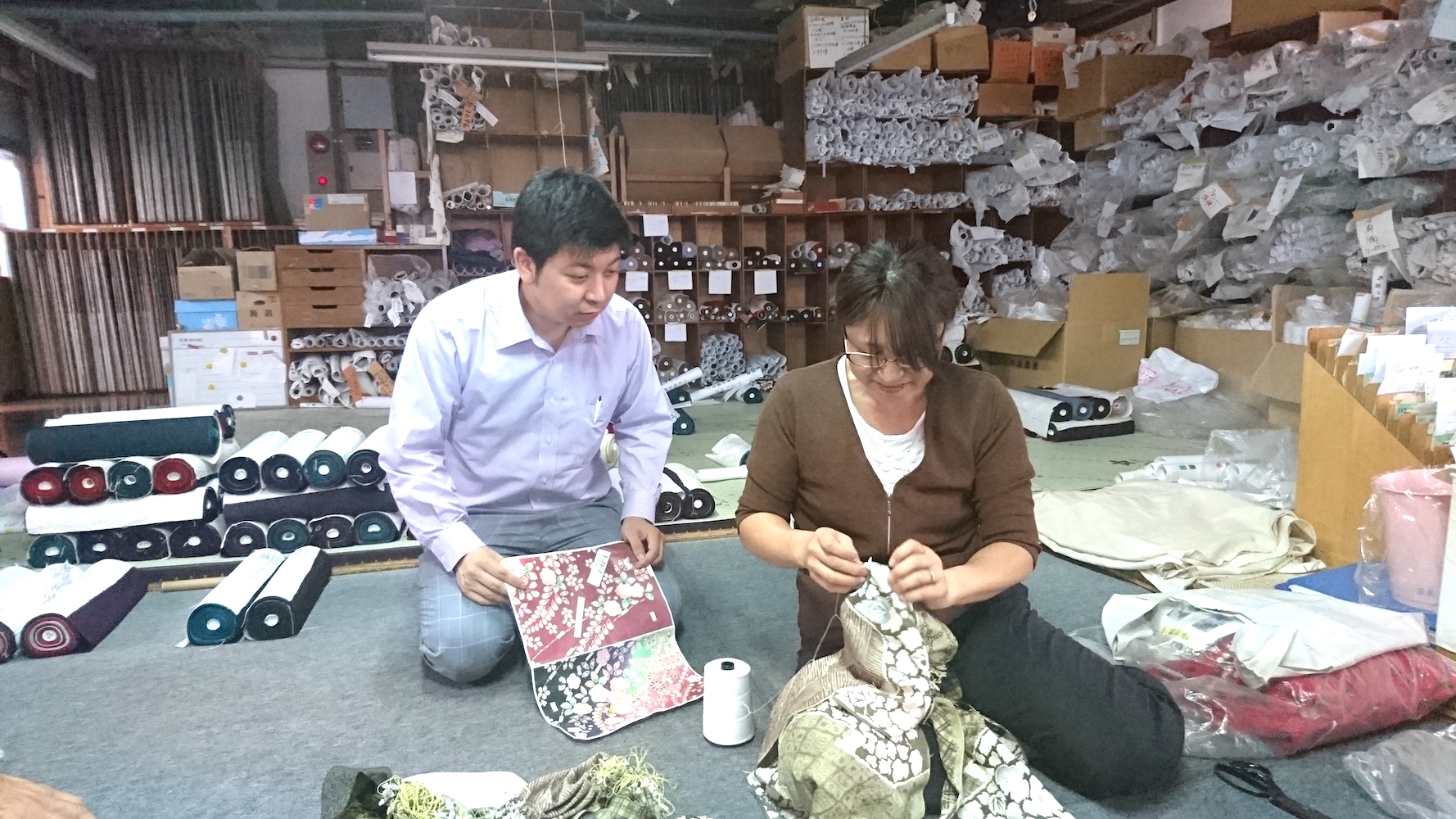 何種類もの染料を使い分け染め上げます。生地の長さは13mにも及び、ムラなく染め上げるには経験を積んだ職人の腕が必要とされる工程です。