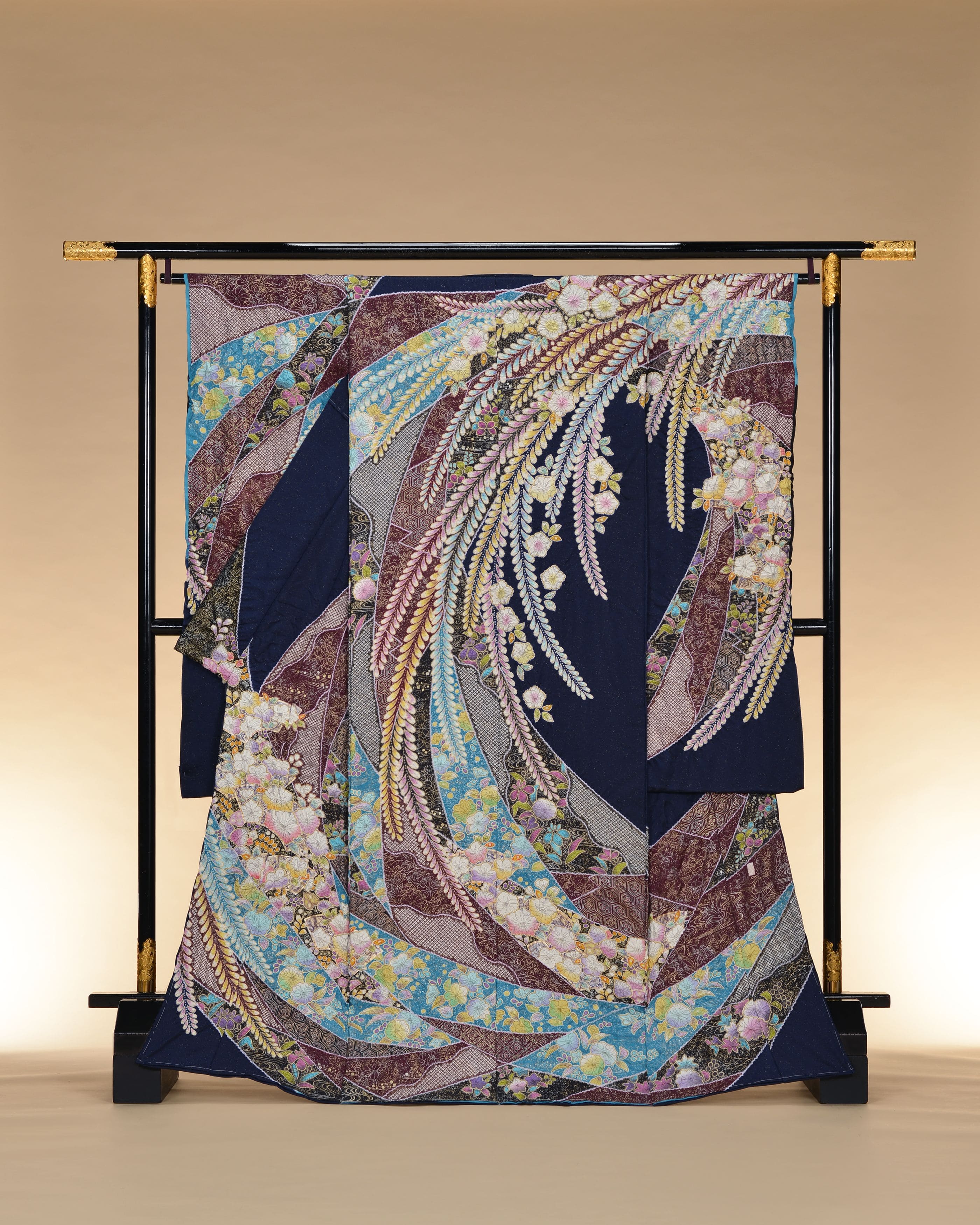 お写真はあまのやのお取り扱いの「辻が花振袖」。新潟県十日町の「翠山工房」の代表ブランド「翠山辻が花」です。落ち着いた紺をベースに、藤の花など季節の花々が咲き誇る華やかな一着です。