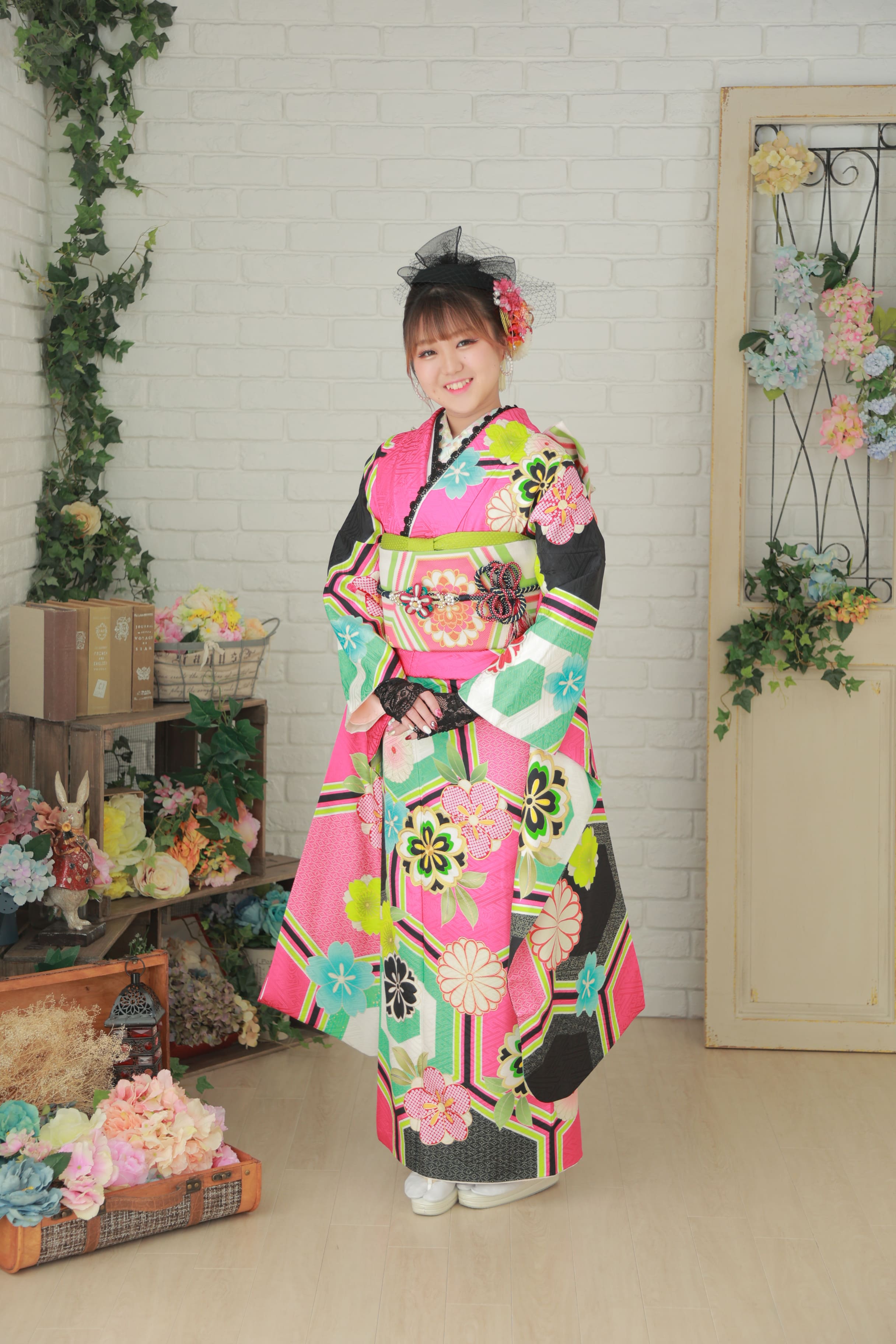 加えて、こちらのお嬢様はヘアーをアクセントにコーディネート!落ち着いた可愛らしいピンクの髪色が全体のトーンをアップ!また、帯締めや帯揚げ、さらには着物のふちにピンクを取り入れることでポイントごとの色合わせというお洒落にも挑戦です!