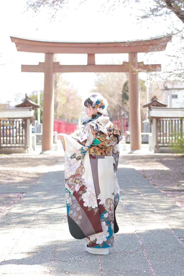 また、その配色を邪魔せずなおかつ黒髪に映えるような明るいホワイトのヘッドドレスが振袖との色彩がぴったりなので後姿も統一感があり素敵です。