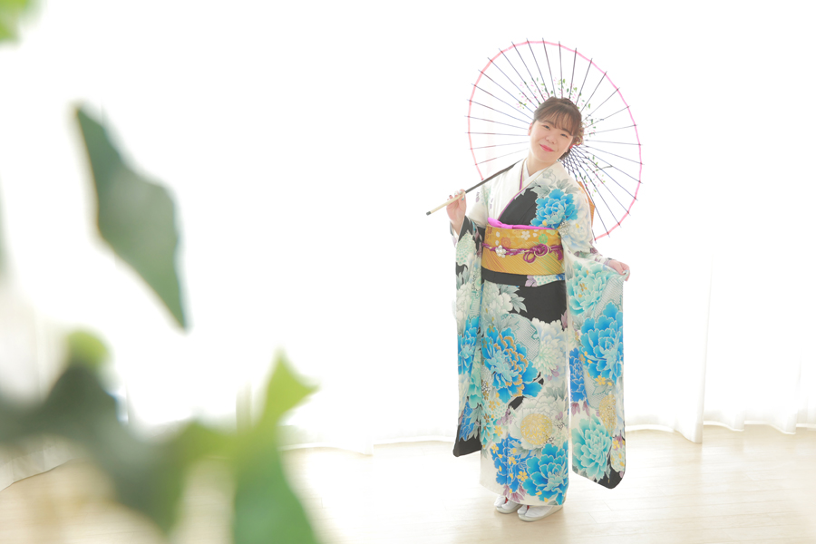 まずは、白地にポイントに大輪のブルーの花が特徴の振袖を華やかかつかっこよく着こなしてくれたお嬢様です。花の柄が大きくブルーを使っている点がモダン柄になります。