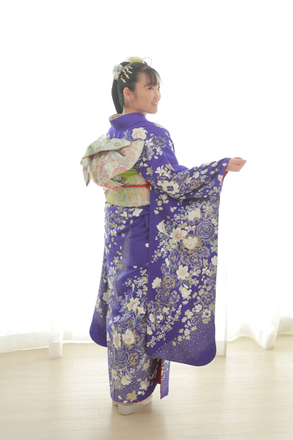 とても鮮やかな紫色で、素敵ですね!着物全体に柄のある総柄になっていて、成人式らしい華やかさがあります。柄にはバラやユリなどが描かれており、モダン風の振袖となっています。