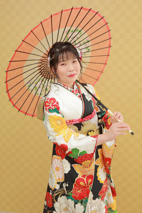 今回は、黄色の振袖を着られたお嬢様と、白と黒の2色を使った振袖を着られたお嬢様をご紹介していこうと思います^^