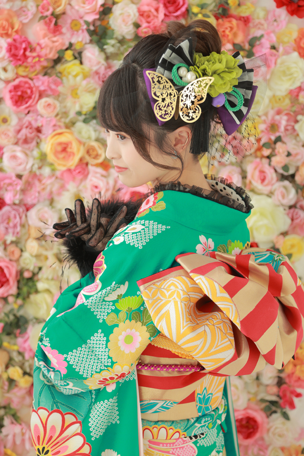 1着目は緑の振袖です。緑といってもたくさんの種類がありますが、