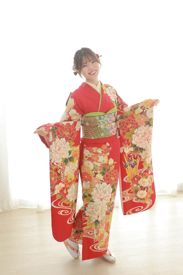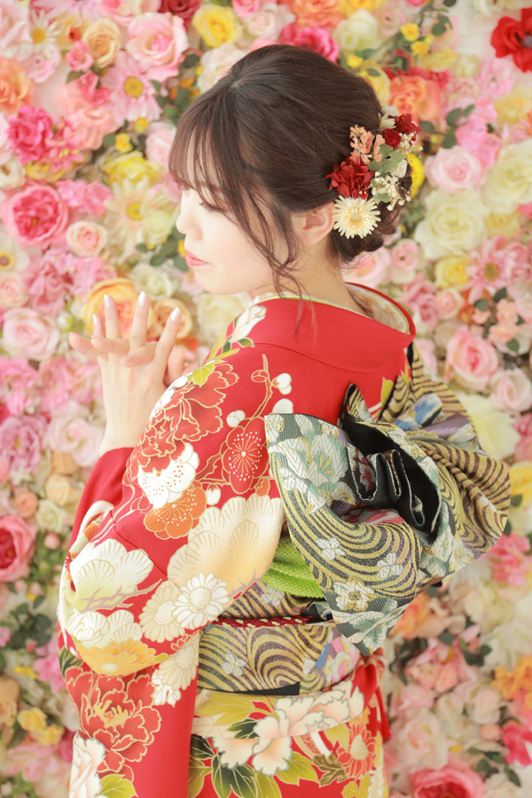 赤の振袖に合わせた帯も珍しい文様ですね!帯の柄にある緑とピンクの花がアクセントになっており