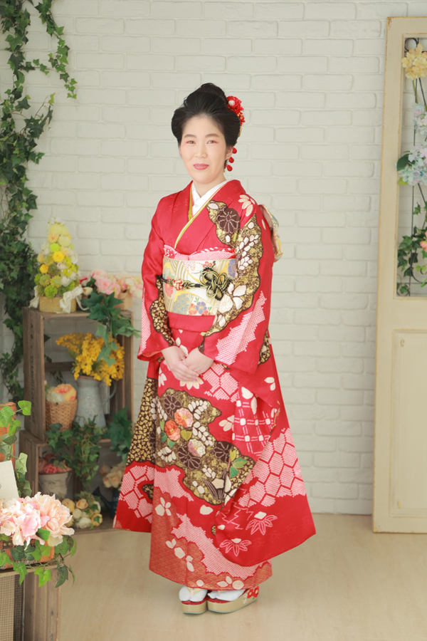 赤の振袖は、どの時代でも人気の色になりますね。赤は赤でも、朱色に近い赤や深みのある赤などたくさんの赤があります。実は、深みのある赤やエンジ色などは写真で出づらい、表しづらい色になります。目で見たより明るく写ることがあります。目には見えないですが光にも色がありその影響を受けやすいのが赤色です。着物を選ぶ際写真写りも重要視したいお嬢様はスマートフォン等のカメラでも大丈夫ですので加工などのフィルターは付けずに写真を撮ってみてください。目で見た色と写真で撮った時の色両方を見て振袖を決めるのもいいと思います。2色の色合いが楽しめるのもお徳感があっていいですね。