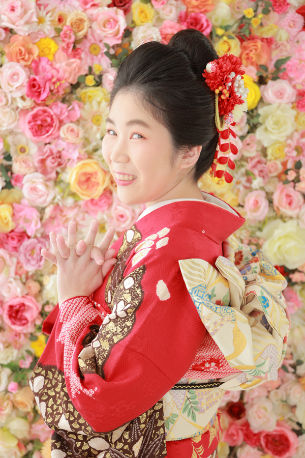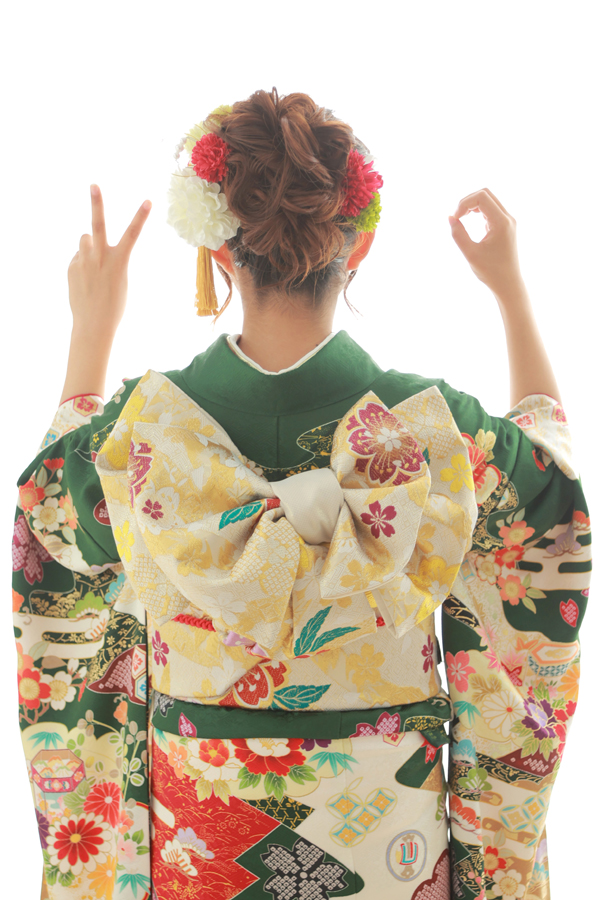 そして顔は見えないですが、帯、髪型が分かるこちらのバックショットは人気のポーズになります。スタジオではお顔側から光を当てているので振袖、髪型が引き立つようなライティングになっています。簡単なポーズになっているので映える背景を探してご自身のカメラで撮影するのも楽しそうですね。