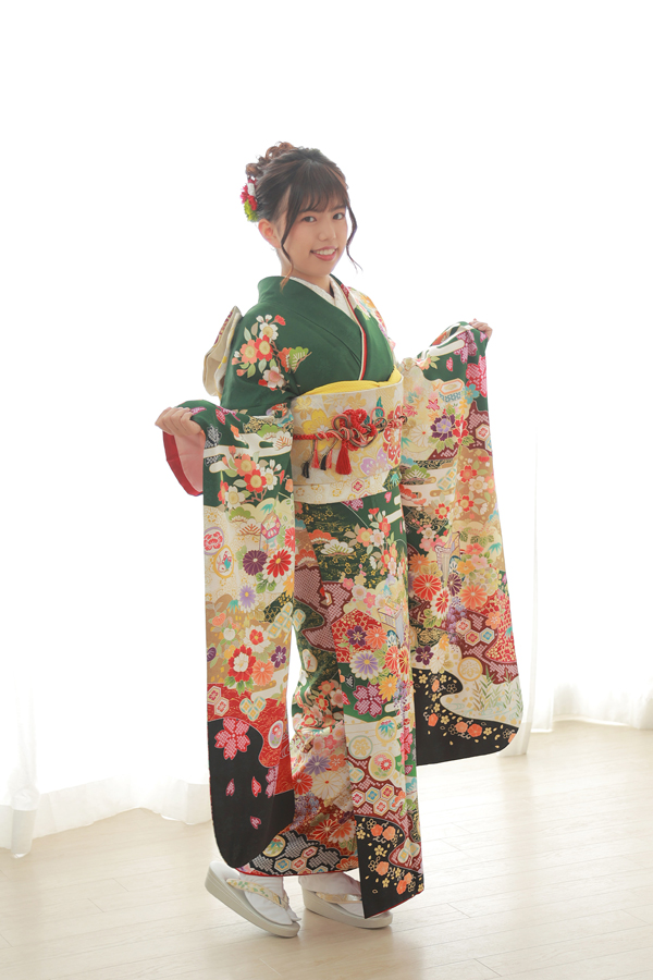 赤同様人気の高い緑の振袖は落ち着いた優しい印象を与えてくれます。人気が高いため色合いやデザインが豊富になってきています。和柄デザインですと品良い優美な振袖になりますり、洋風デザインです洗練された都会的イメージになったり色々なタイプから振袖を選ぶことが出来るのも魅力ですね。