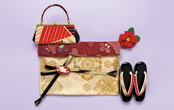 クラシカルかつおしゃれに見せるにはスパイシーな差し色が重要。ゴールドがいっそう上品に輝く深みのある赤や黒の帯揚げ、帯締めなどでスタイリッシュにコーディネートを。