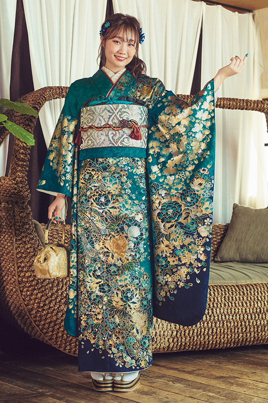 南国の海の色を連想させる「ターコイズブルー」や「エメラルドグリーン」は、色黒のお嬢様によく似合う振袖カラーの一つです。
