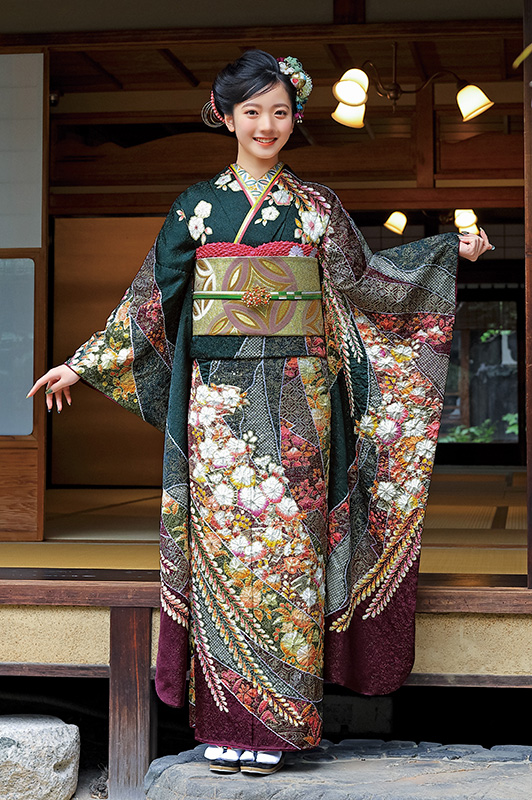 こちらは渋めのダークグリーンの地色に、優しい暖色系カラーの花模様が描かれた振袖です。