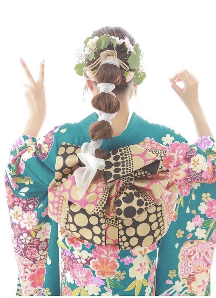 2021年トレンドのキャンディヘア。 膨らんでいる部分が、キャンディーのように丸くてかわいい!リボンを巻いて、より成人式らしい華やかでよりキュートな印象に。振袖の甘めのカラーのグリーンとピンク、帯の柄の丸ともマッチしています♪