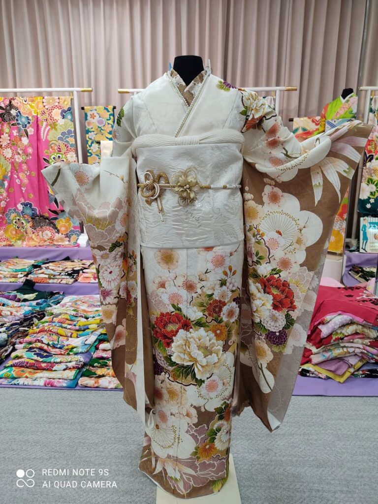 お写真右側は王道の金地の帯です。菊に梅に桜と、和の花々のデザイン。